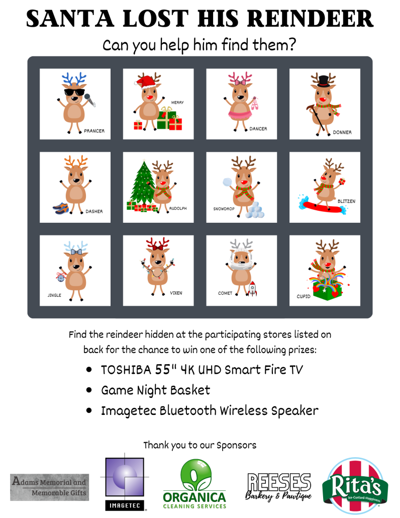 Help Santa find his lost reindeer! Look for Dasher, Dancer, and the whole gang at local stores around McHenry. Get a store sticker on the game card when you find them.